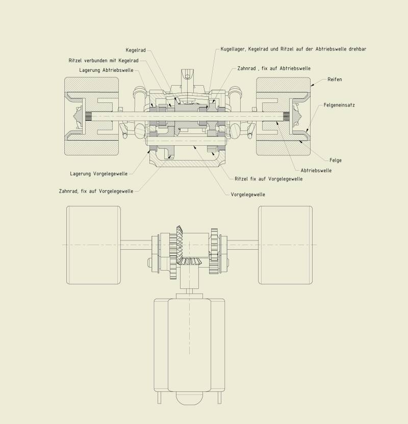 Deswegen habe ich ein 3 stufiges Getriebe entwickelt, mit einer Kegelradstufe, und einer Vorgelegewelle- die Gesamtübersetzung ist 1:4, sodass, die etwa 110g leichten F1 Autos, in diesem Fall von 1976, mit etwa 7m/s herumflitzen werden
